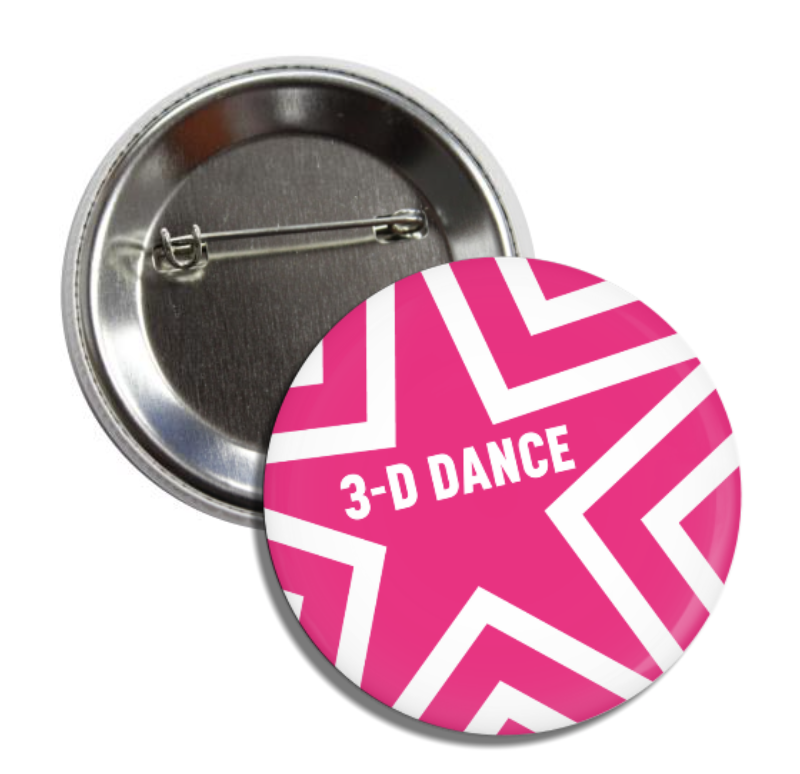 2.5 inch metal button proudly displays the 3-D Dance logo. Latch pin clasp on back side.